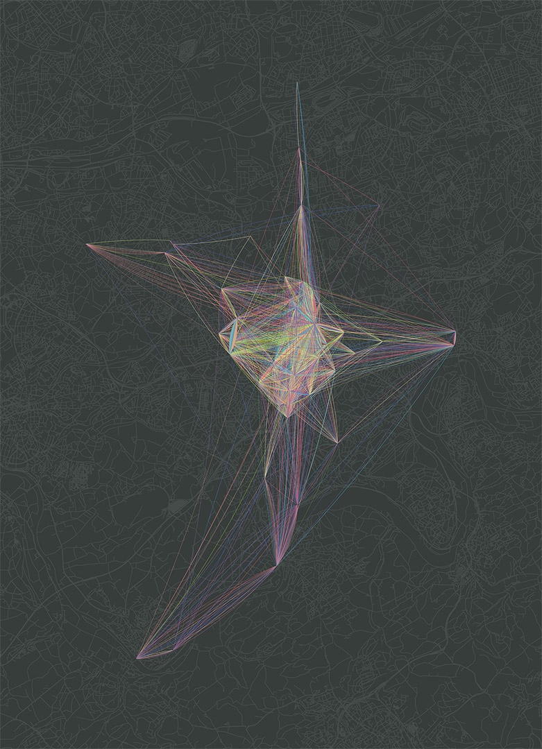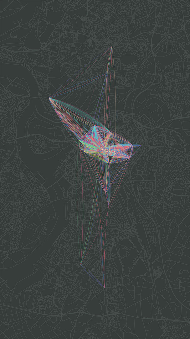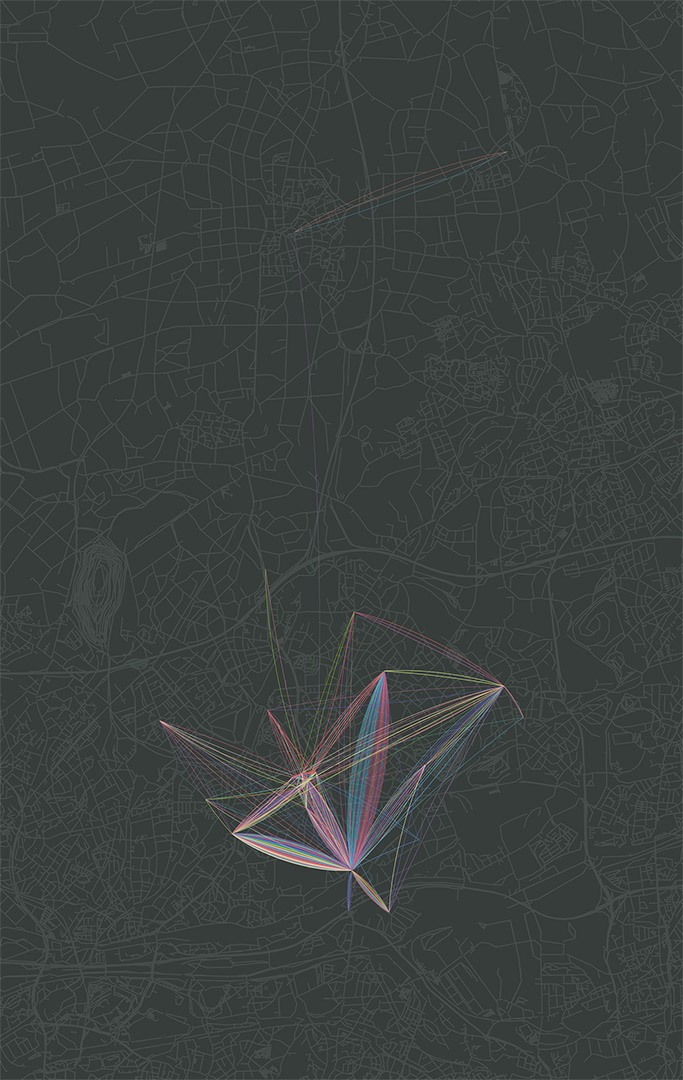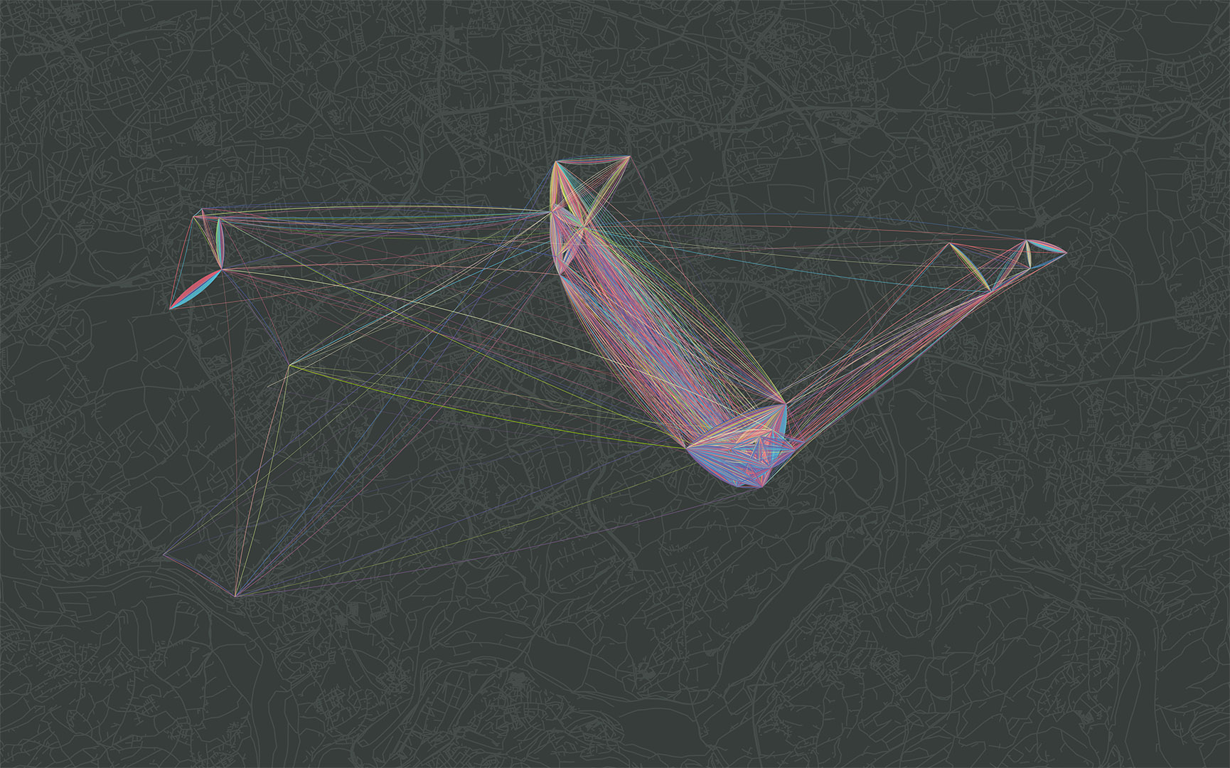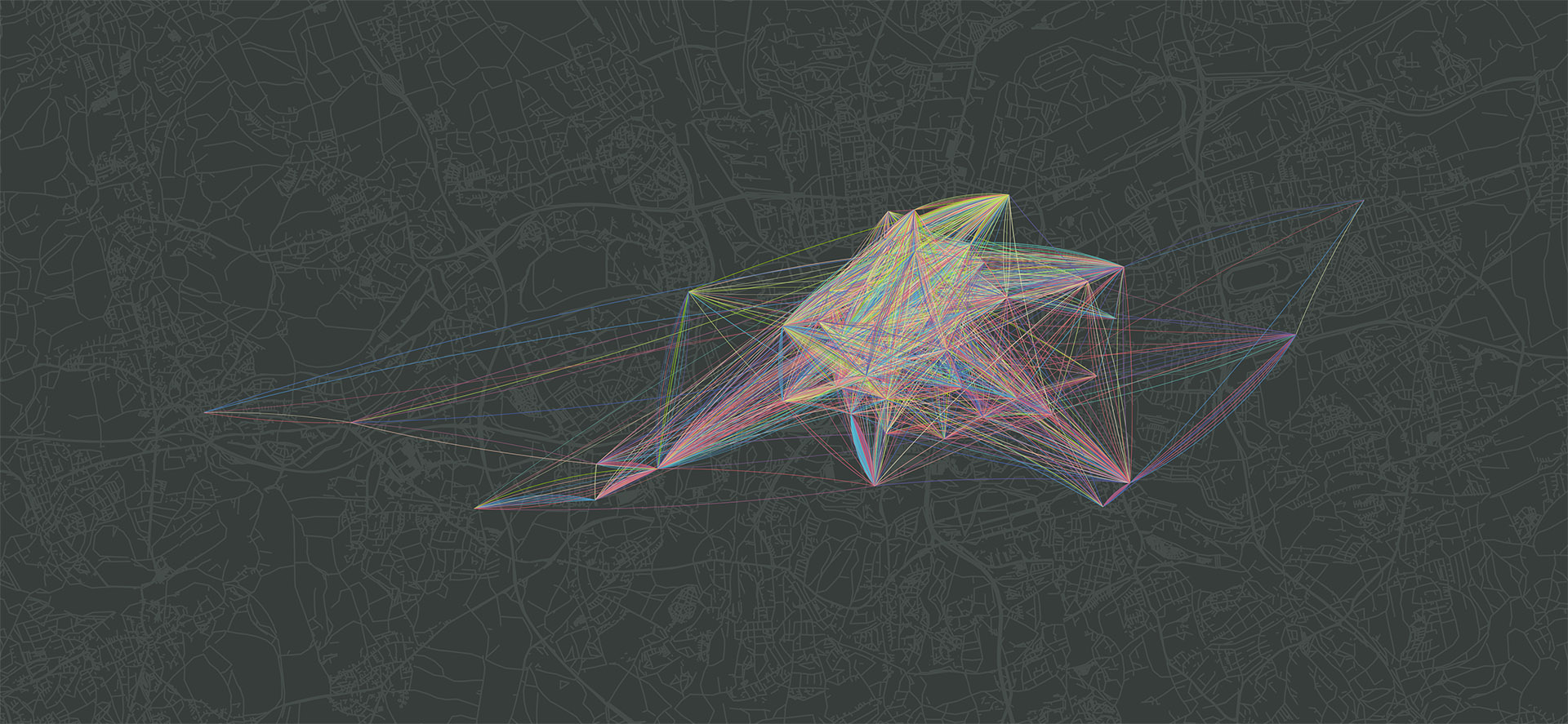 Diese Bilder wurden mit eigens dafür entwickelter Software aus anonymisierten Daten des Fahrradverleihsystems „metropolradruhr“ generiert. Die Daten umfassen die letzten Jahre.
