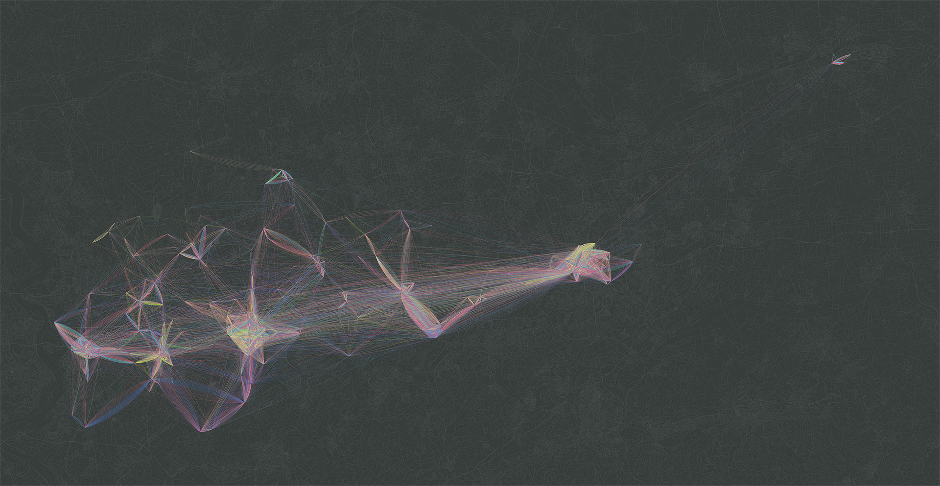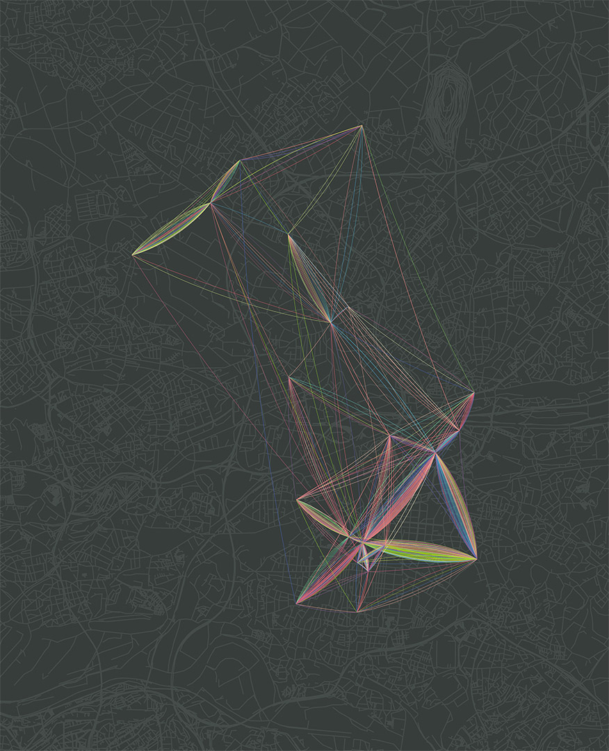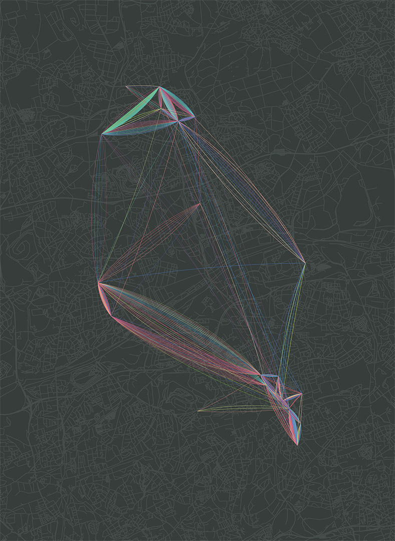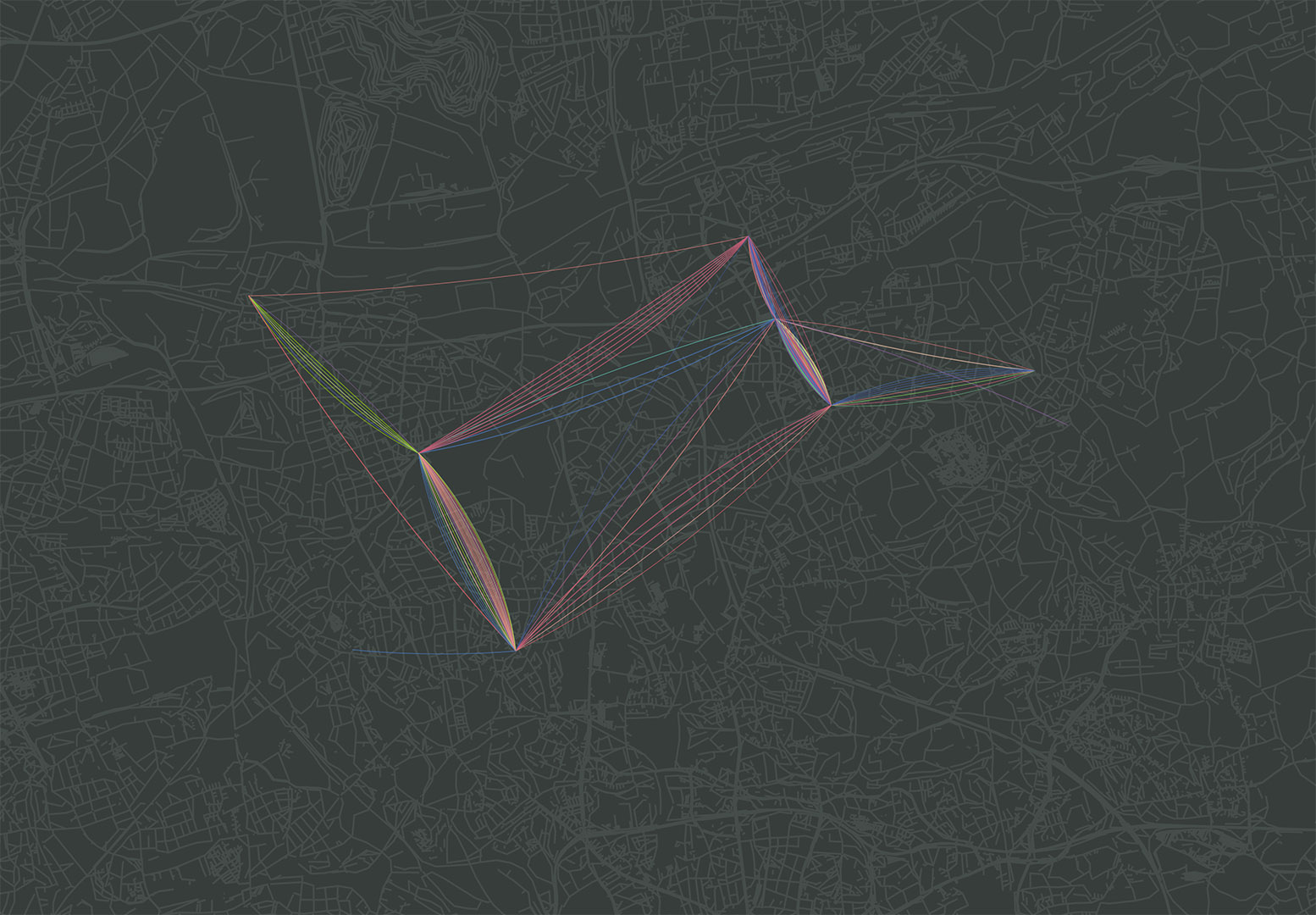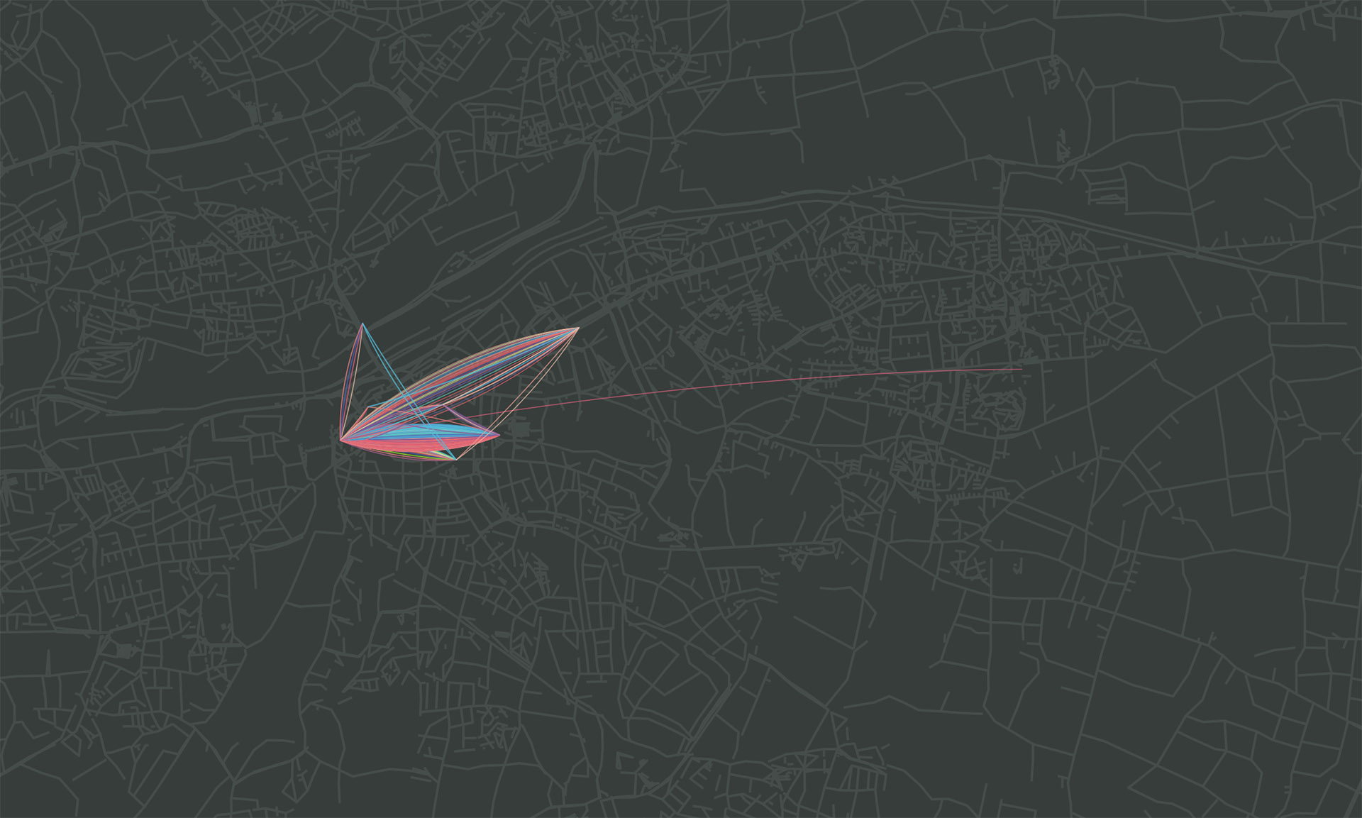 Diese Bilder wurden mit eigens dafür entwickelter Software aus anonymisierten Daten des Fahrradverleihsystems „metropolradruhr“ generiert. Die Daten umfassen die letzten Jahre.