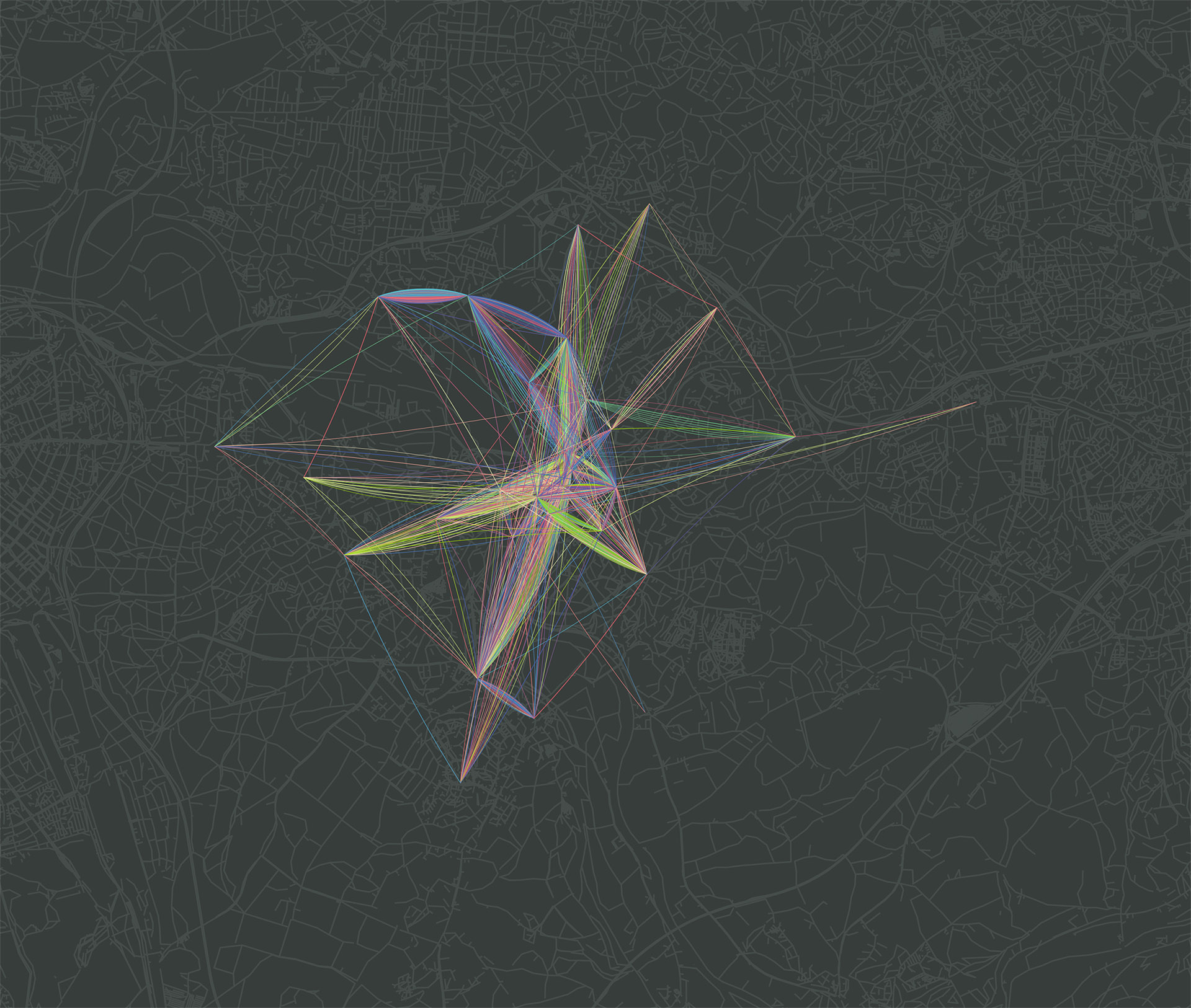 Jede Fahrt wird im Bild durch eine Linie repräsentiert, deren Start- und Endpunkt der geografischen Position der metropolradruhr-Station entspricht, an der das Fahrrad ausgeliehen bzw. abgegeben wurde.